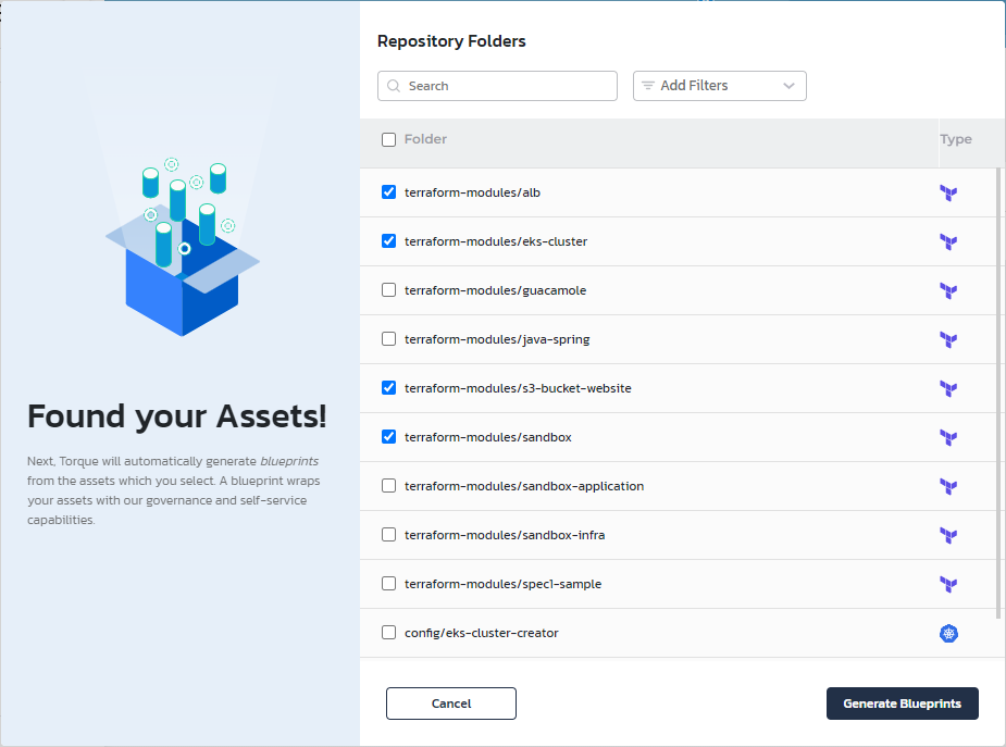 When developing a new blueprint, Jarvis provides you with the ability to automatically discover the different IaC and Automation assets in your connected source control repository, and generate a blueprint for a single asset (or generate multiple single-asset blueprints in one go).