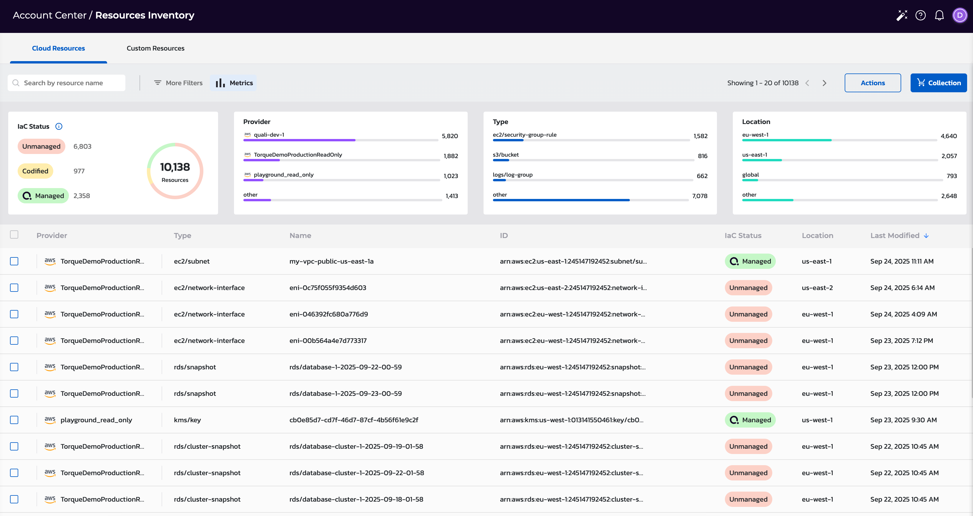 - IaC Status: Indicate whether resources are unmanaged, codified, or managed.